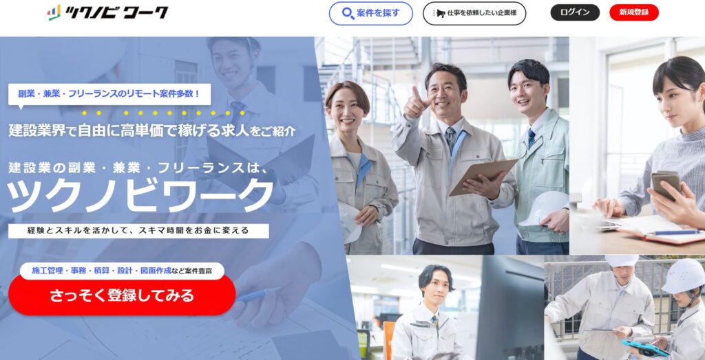 ツクノビワークは建設業界に特化したフリーランス・副業案件のマッチングサービスです。