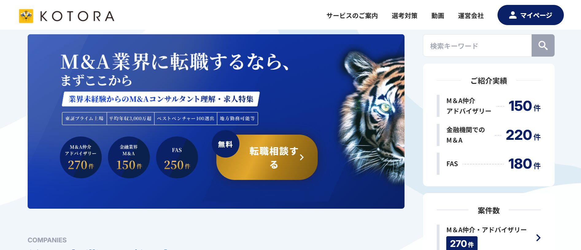 コトラは、M&A業界に特化した転職支援サービスです。コンサル・金融系にも精通しているため、コンサルや金融系からM&A仲介に転職したい方にもおすすめのエージェントです。